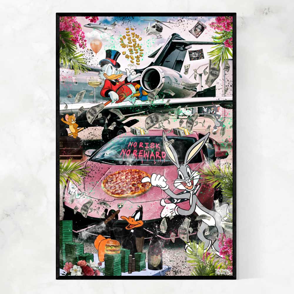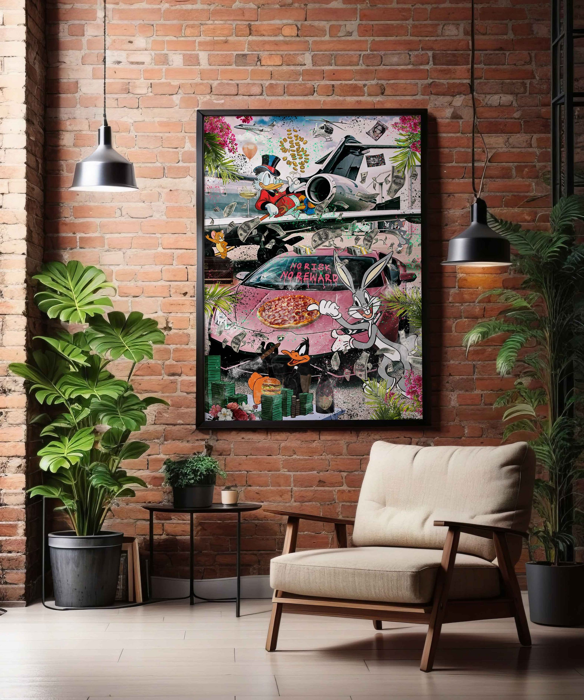 A bold, high-energy mashup of classic cartoon icons living the ultimate luxury dream. Private jets, supercars, flying cash and the perfect mix of hustle and play. This statement piece is for those who go all in - because fortune favors the fearless. Where cartoon meets the unexpected. Framed in sleek black, this exclusive creation combines luxury, mystique and a modern twist. Only 10 pieces made.